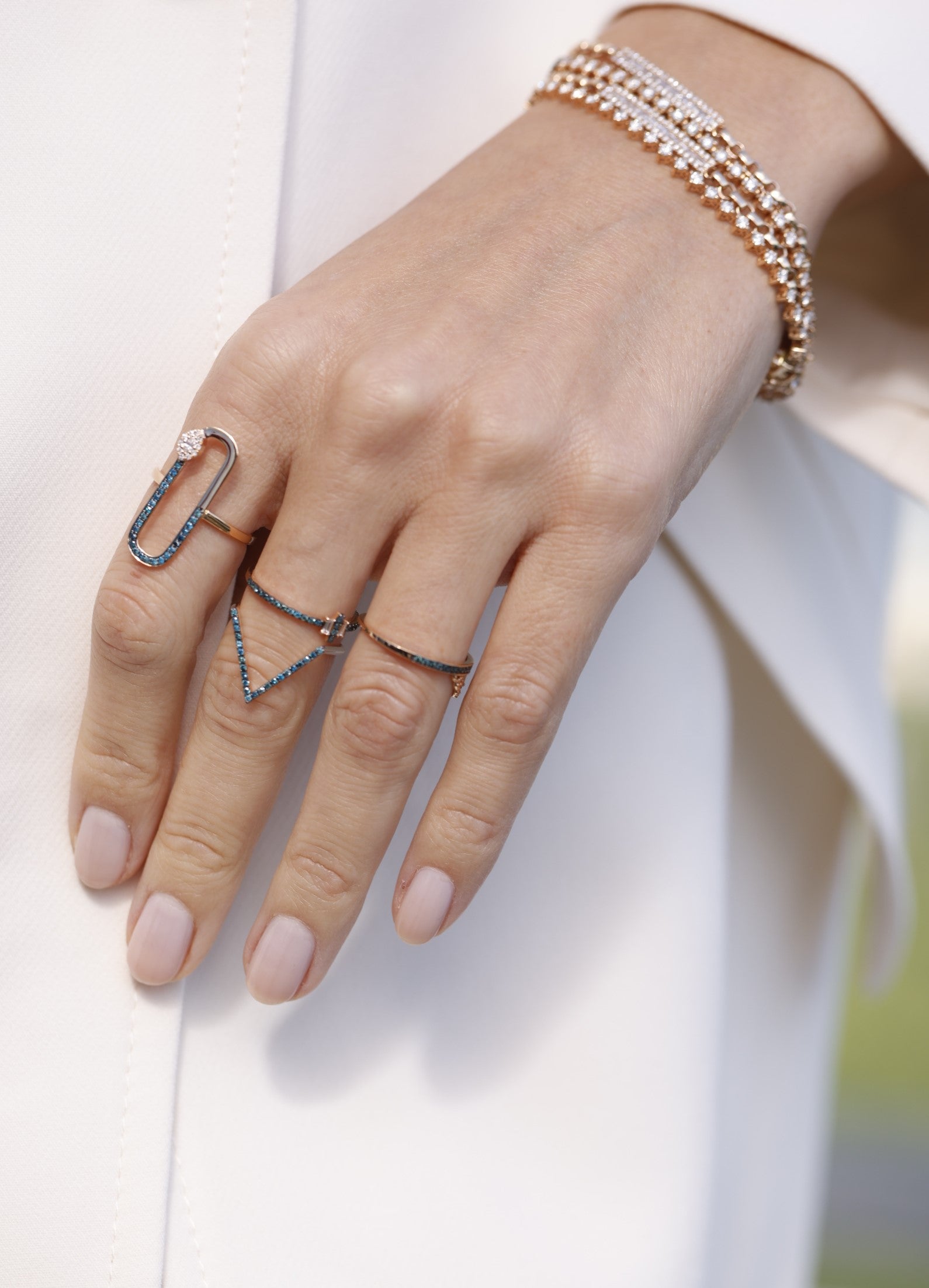 Göz alıcı statement mücevherler, buradayım demek isteyen gelinlerin seçeneğidir. Düğünden sonra da konuşulmak isteyen cesur kızlar, daha geometrik ve gösterişli mavi, konyak ve siyah pırlantalı sofistike parçalara yönelebilirler.