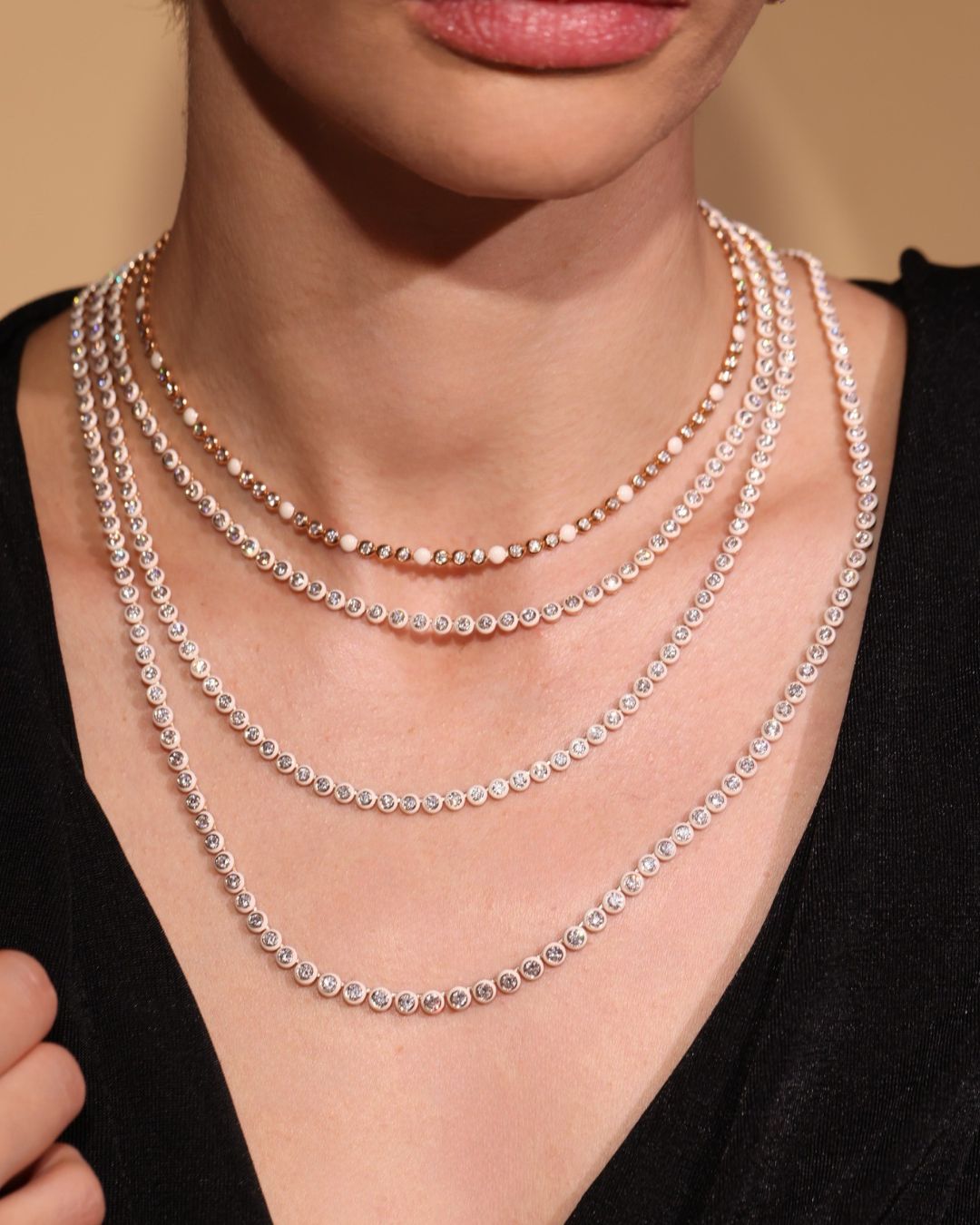 Mineli pırlanta su yolu kolyeler, yalnızca özel davetlerde değil, günlük kombinlerde de rahatlıkla kullanılabilir. Şık bir gece elbisesiyle zarif bir ışıltı katarken, kot pantolon ve deri ceket gibi casual parçalarla kombinlendiğinde modern ve özgün bir tarz yaratır. Luxo'nun su yolu tasarımları, gündüzden geceye her ortama uyum sağlayarak stilinizi tamamlar.