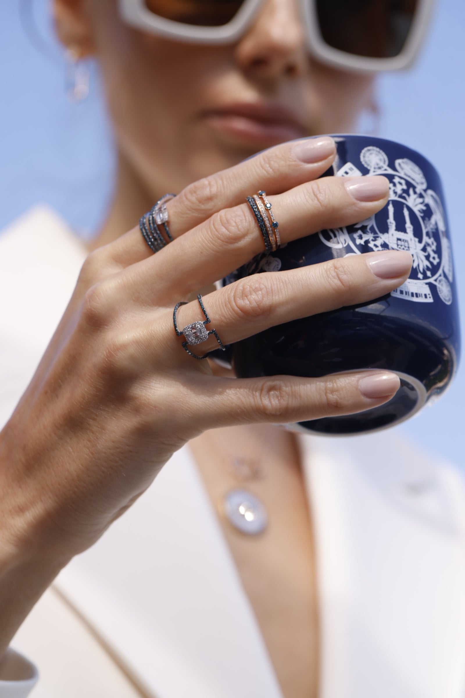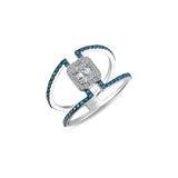 Bu şık ve zarif pırlanta yüzük, sofistike tasarımıyla dikkat çekiyor. İki zarif bant üzerinde yer alan mavi pırlantalar, yüzüğe benzersiz bir hava katıyor ve zarafeti doruğa taşıyor.