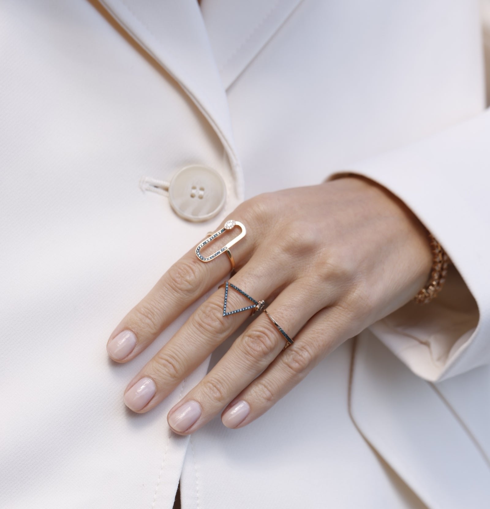 14 ayar rose altının sıcaklığıyla buluşan mavi pırlantalar, adeta gecenin karanlığında parıldayan yıldızlar gibi ışıldıyor. Yüzüğün zarif ve keskin V formu, stilinize hem cesur hem de sofistike bir dokunuş katacak.