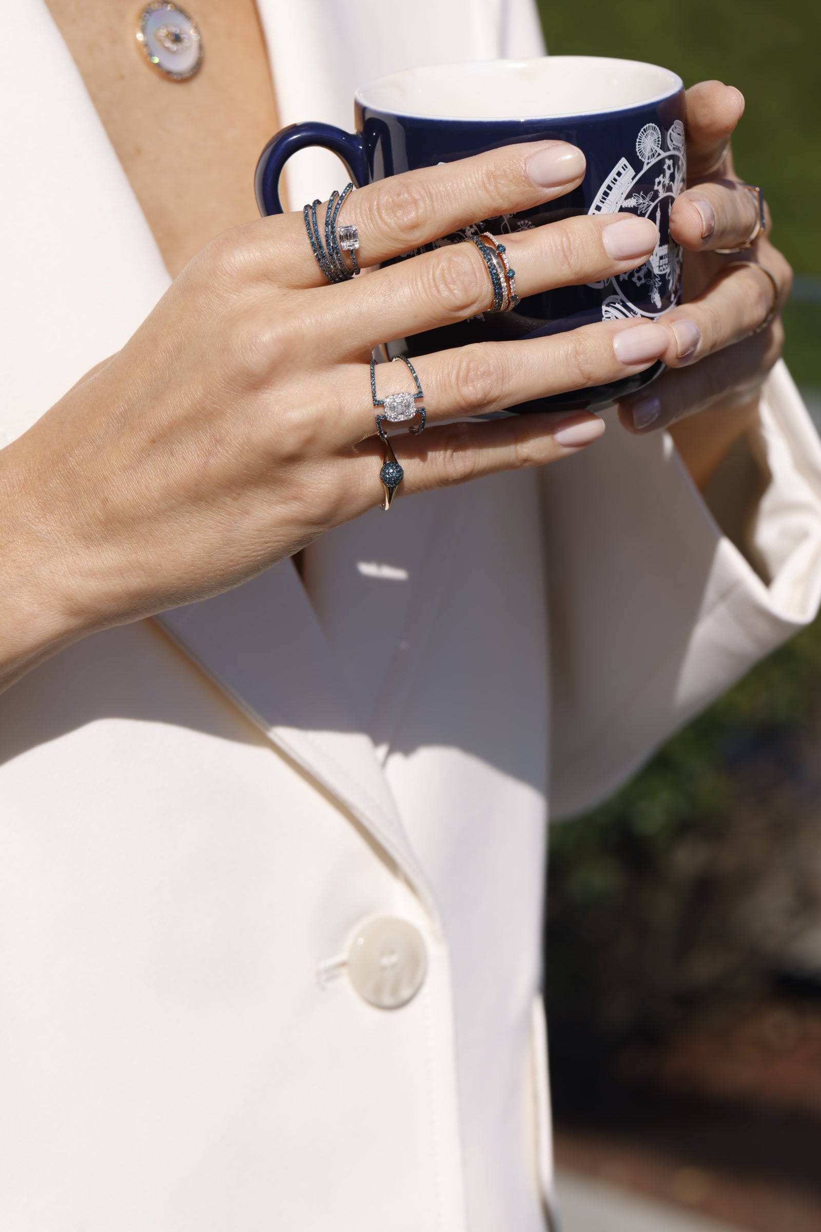 Yüzüğün tasarımında yer alan yuvarlak kesim mavi pırlantalar, derin ve etkileyici tonlarıyla göz kamaştırıyor. Bu göz alıcı mavi pırlantalar, yüzüğün tamamında eşsiz bir parıltı yaratırken, onlara eşlik eden yuvarlak ve baget kesim pırlantalar, ışıltıyı daha da artırıyor.