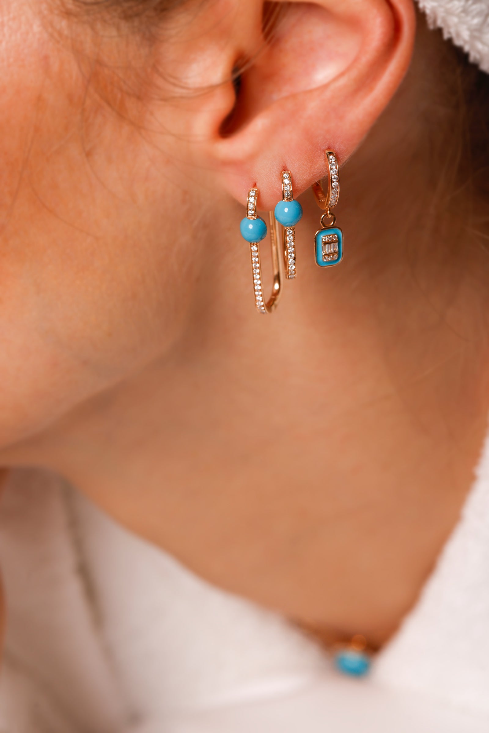 14 ayar rose altının sıcaklığı ile turkuaz minenin canlılığını bir araya getiren bu pırlanta küpe, kulaklarınızda adeta bir şiir gibi yankılanacak.