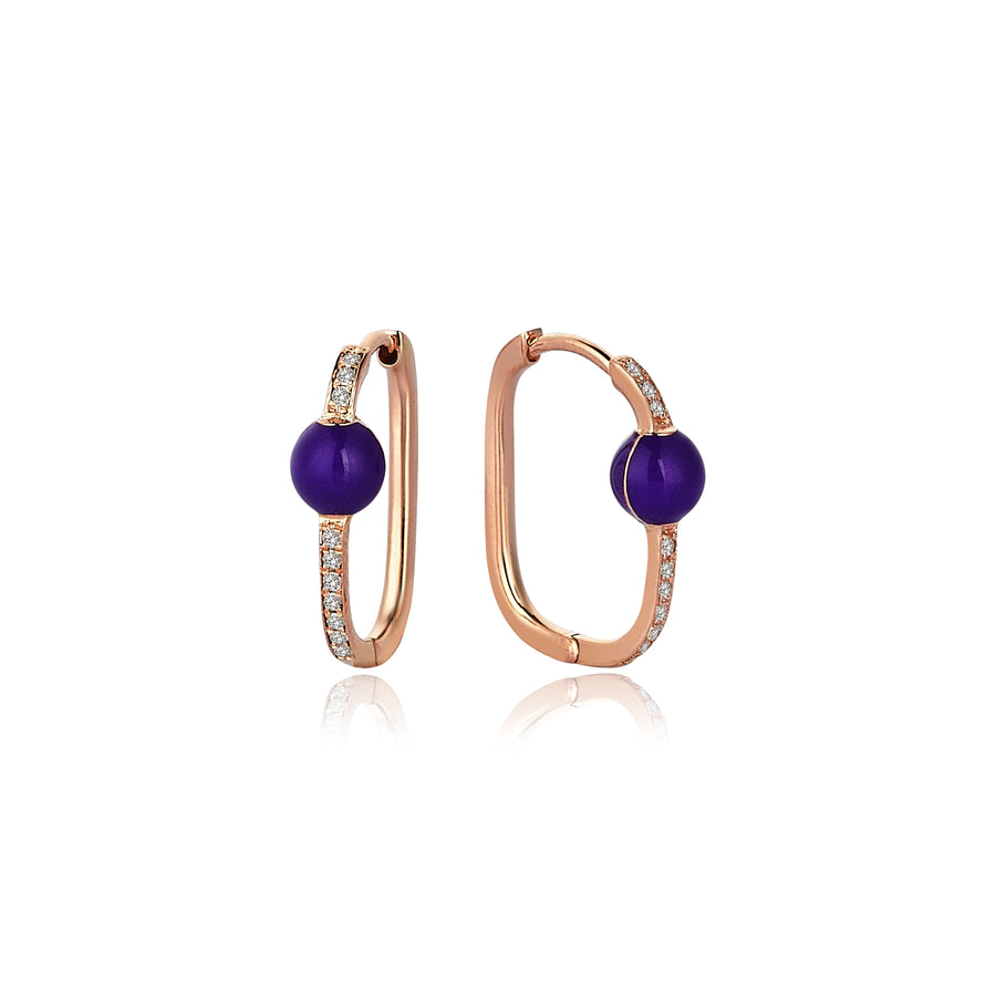 Minimalizmin zarafetiyle renkli tasarımın harmanlandığı bu küpe modeli, 14 ayar rose altının sıcaklığıyla mor minenin derin ve sofistike tonunu kusursuzca buluşturuyor. Küpenin merkezinde yer alan mor mine küre, içsel gücün ve asaletin sembolü olarak tasarıma anlam katarken, pırlanta detaylar her harekette ışıldayan bir şıklık sunuyor.
