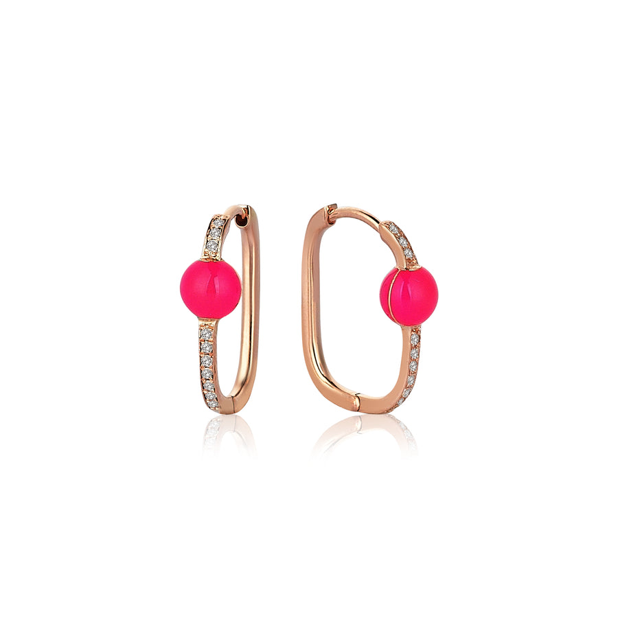 Canlı enerjisi ve zarif ışıltısıyla dikkat çeken bu tasarım, 14 ayar rose altının sıcak tonlarını feminen pembe mine ile bir araya getiriyor. Küpenin merkezinde yer alan parlak pembe mine küre, cesur ama sofistike bir stilin simgesi olarak öne çıkarken; pırlanta detaylarla çevrelenen halka formu her adımda ışığı zarafetle yansıtıyor.