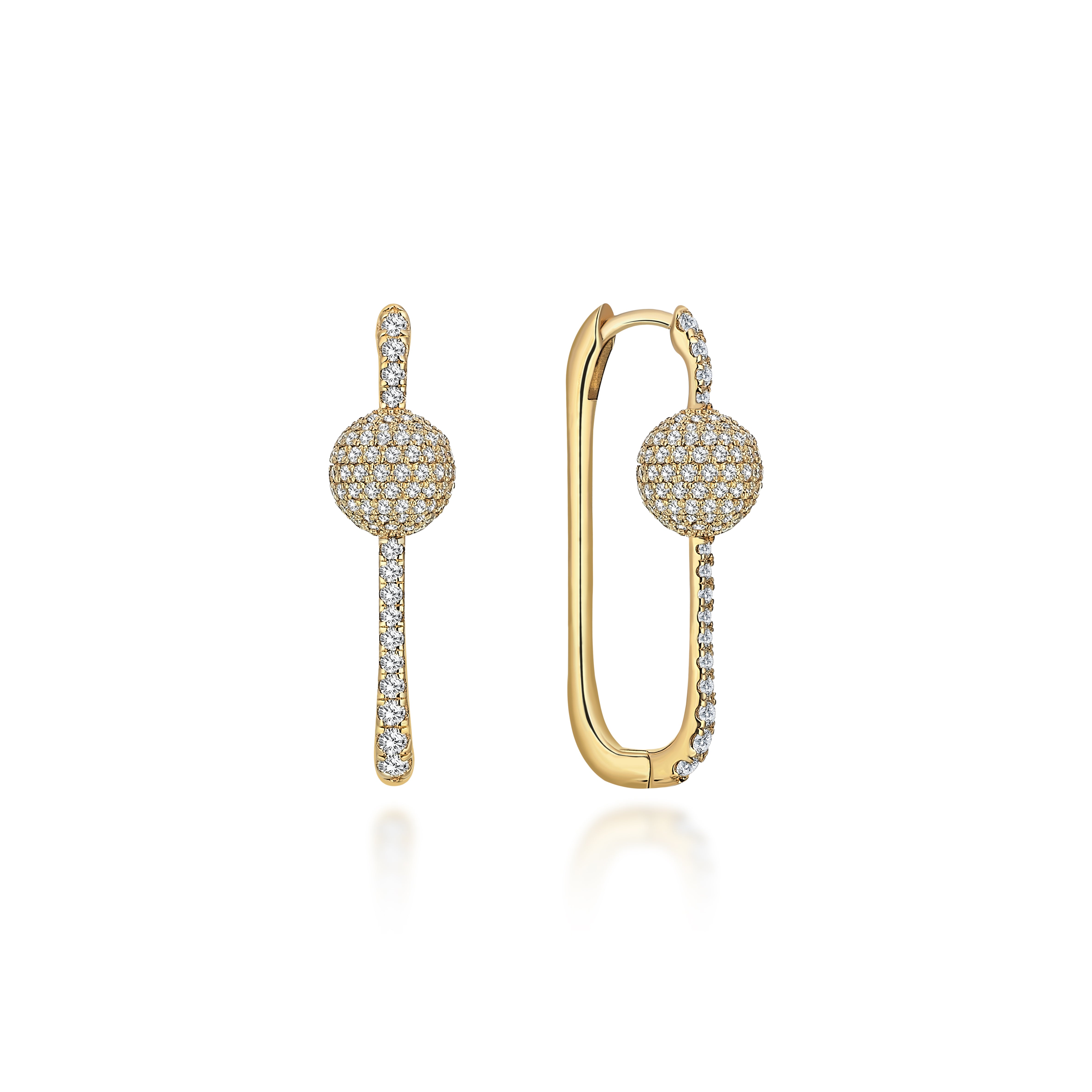 Minimal formların güçlü siluetiyle buluştuğu bu büyük boy küpe, geometrik zarafetiyle hem klasik hem avangart stillere mükemmel uyum sağlıyor. Ortasındaki pırlanta küre detayı, her adımda ışığı yakalayarak sofistike bir parıltı yayıyor.