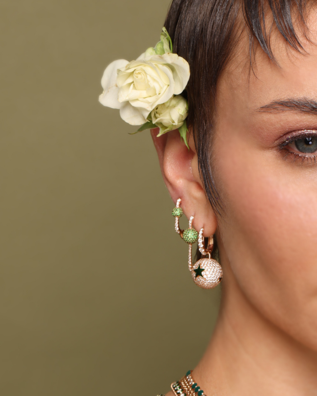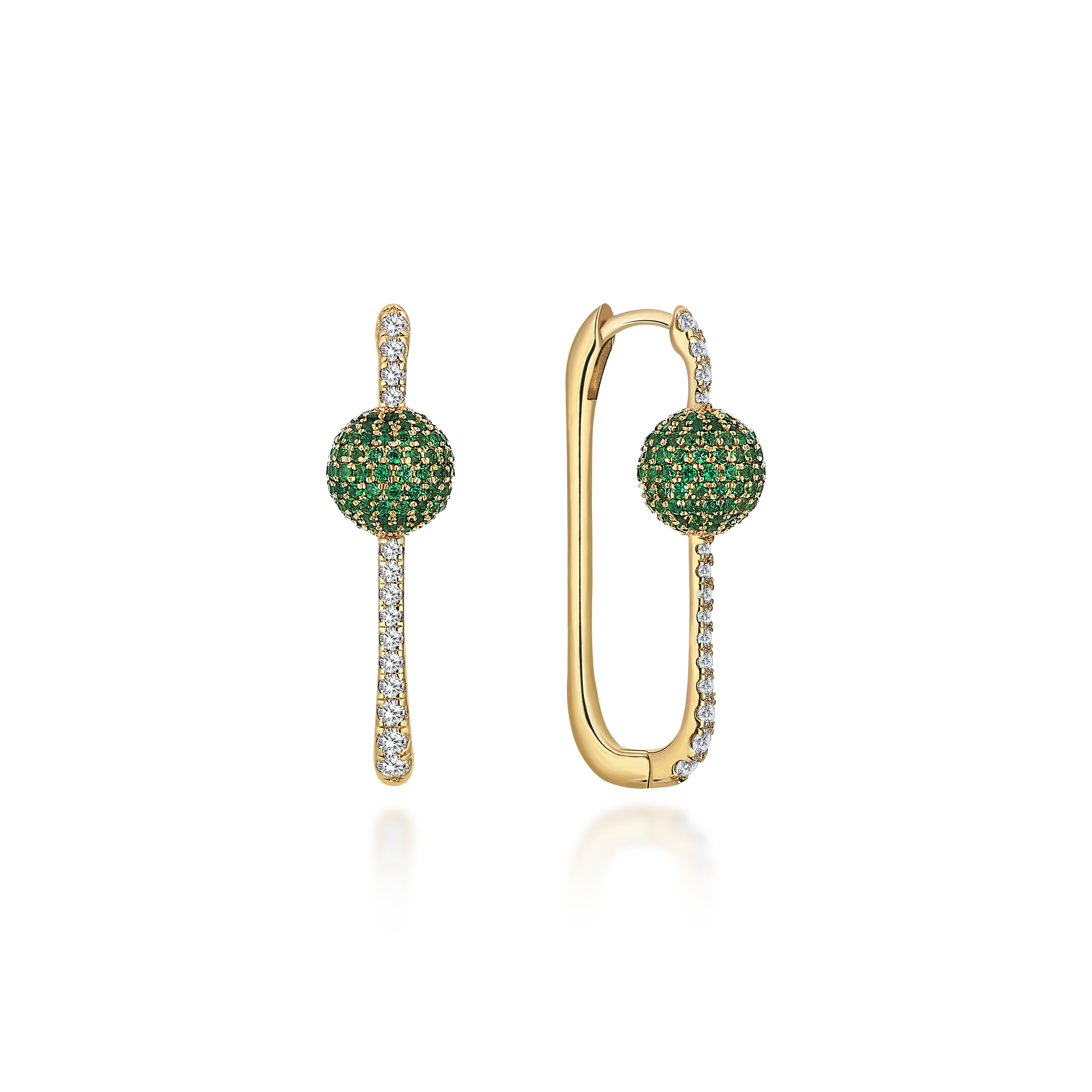 18 ayar altın üzerine titizlikle yerleştirilen pavé beyaz pırlantalar ve zümrüt yeşili savorayt taşlarla bezeli küre detayı, pırlanta küpeyi lüksün ve zarafetin simgesi haline getiriyor.