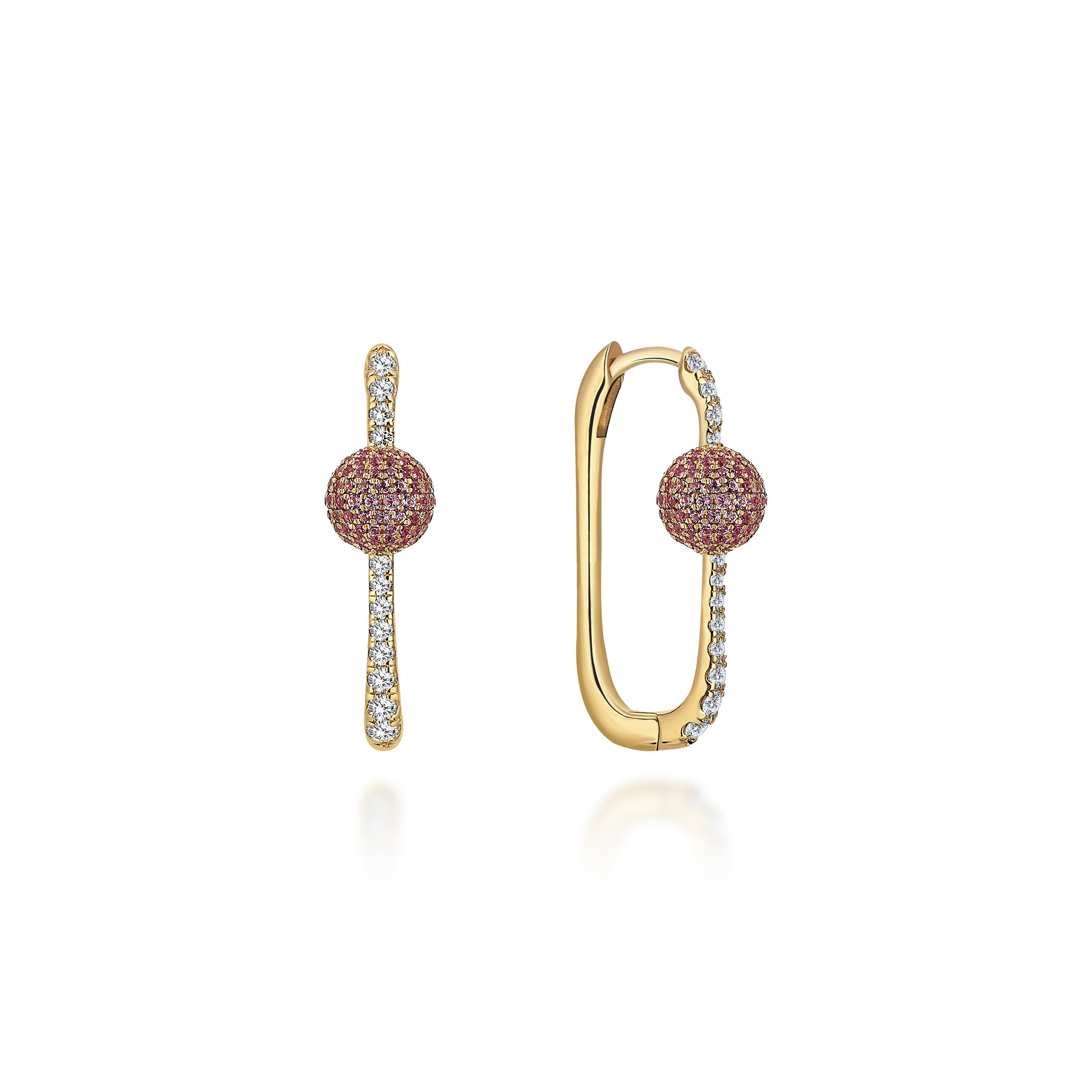 Feminen ışıltıyı modern formla buluşturan bu küpeler, hem zarif hem de iddialı bir görünüm sunuyor. Pembe safirin romantik tonu, altınla kusursuz bir uyum içinde her adımda sofistike bir parıltı yaratırken; küpenin mimari formu, klasik çizgileri çağdaş yorumla yeniden tanımlıyor.