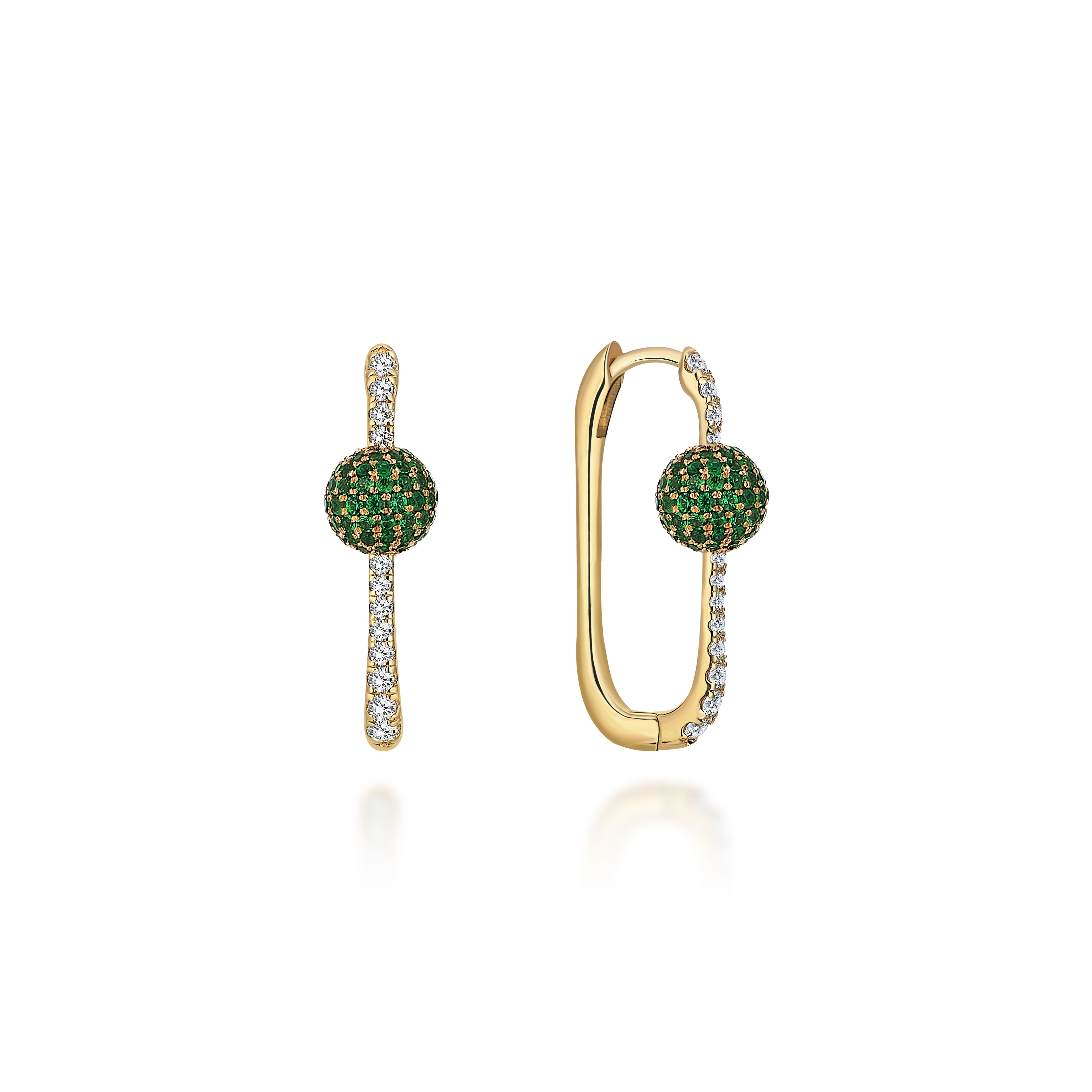 18 ayar altın üzerine titizlikle yerleştirilen pavé beyaz pırlantalar ve zümrüt yeşili savorayt taşlarla bezeli küre detayı, pırlanta küpeyi lüksün ve zarafetin simgesi haline getiriyor.