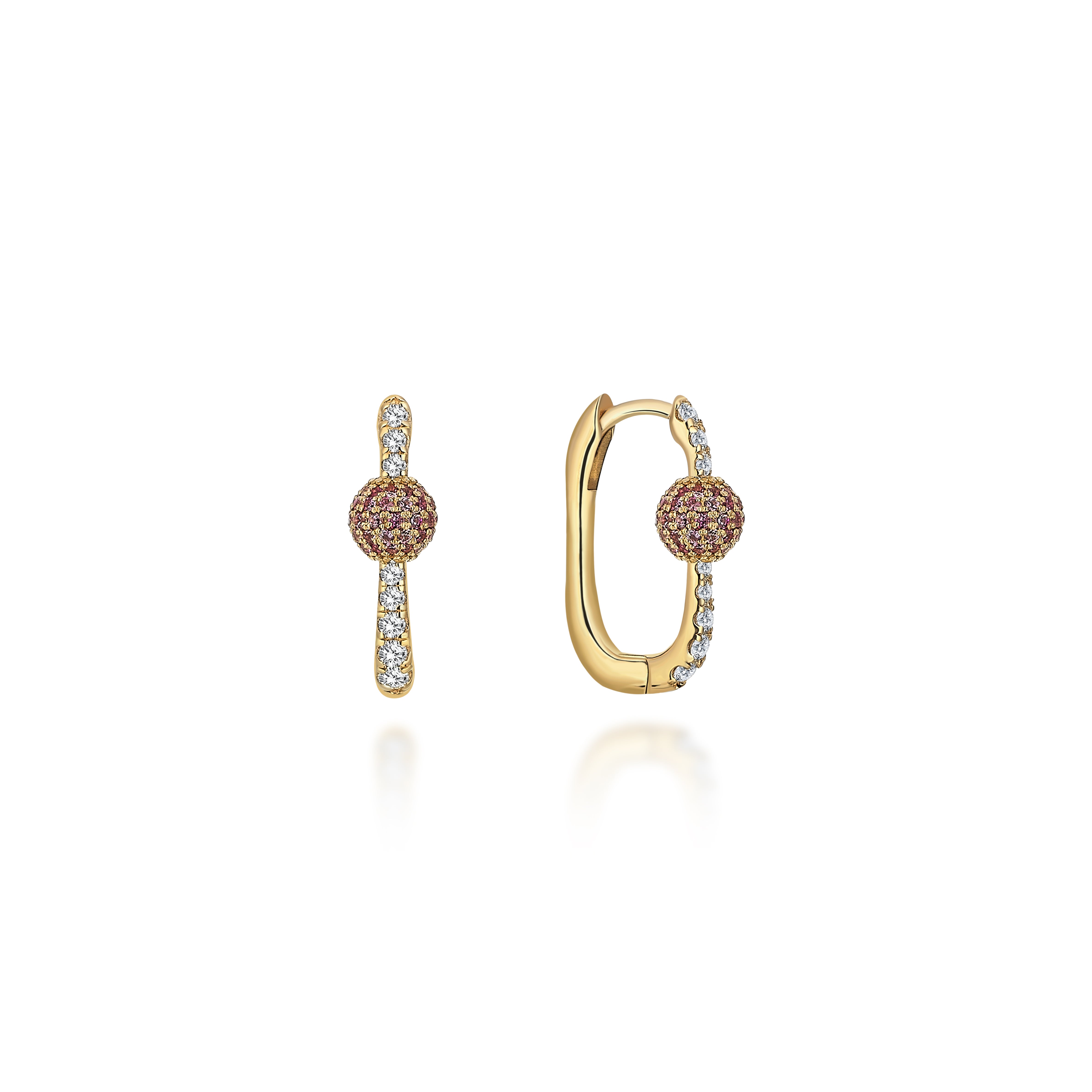 Feminen ışıltıyı modern formla buluşturan bu küpeler, hem zarif hem de iddialı bir görünüm sunuyor. Pembe safirin sıcak tonu, altınla kusursuz bir uyum içinde her adımda sofistike bir parıltı yaratırken; küpenin mimari formu, klasik çizgileri çağdaş yorumla yeniden tanımlıyor.