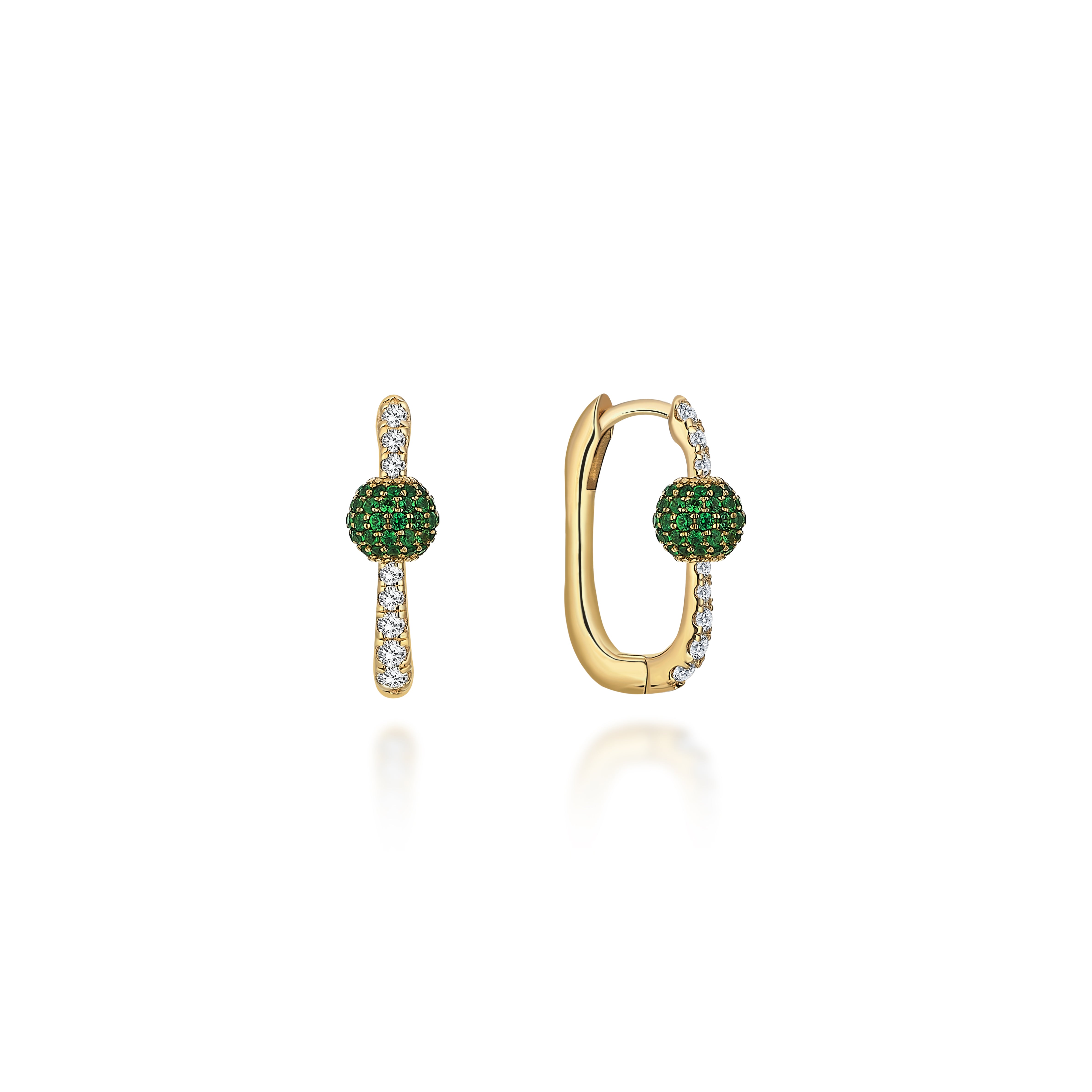 18 ayar altın üzerine titizlikle yerleştirilen pavé beyaz pırlantalar ve savorayt taşlarla bezeli küre detayı, pırlanta küpeyi lüksün ve zarafetin simgesi haline getiriyor.