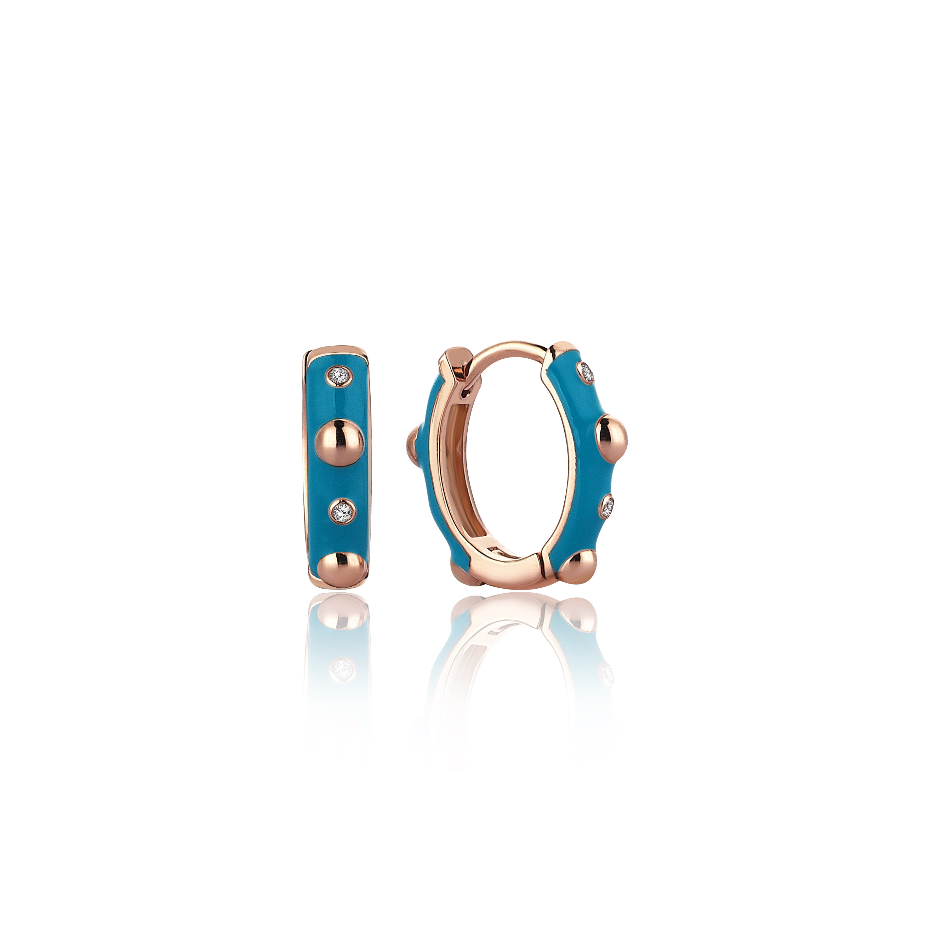 Renkli enerjisi ve zarif detaylarıyla fark yaratan bir tasarım: Neomi Small Bubble Mavi Mineli Pırlanta Halka Küpe, 14 ayar rose altının sıcak tonlarıyla buluşan canlı mavi mine yüzeyi ve ışıltılı pırlanta detaylarıyla modern şıklığın yeni tanımı.
