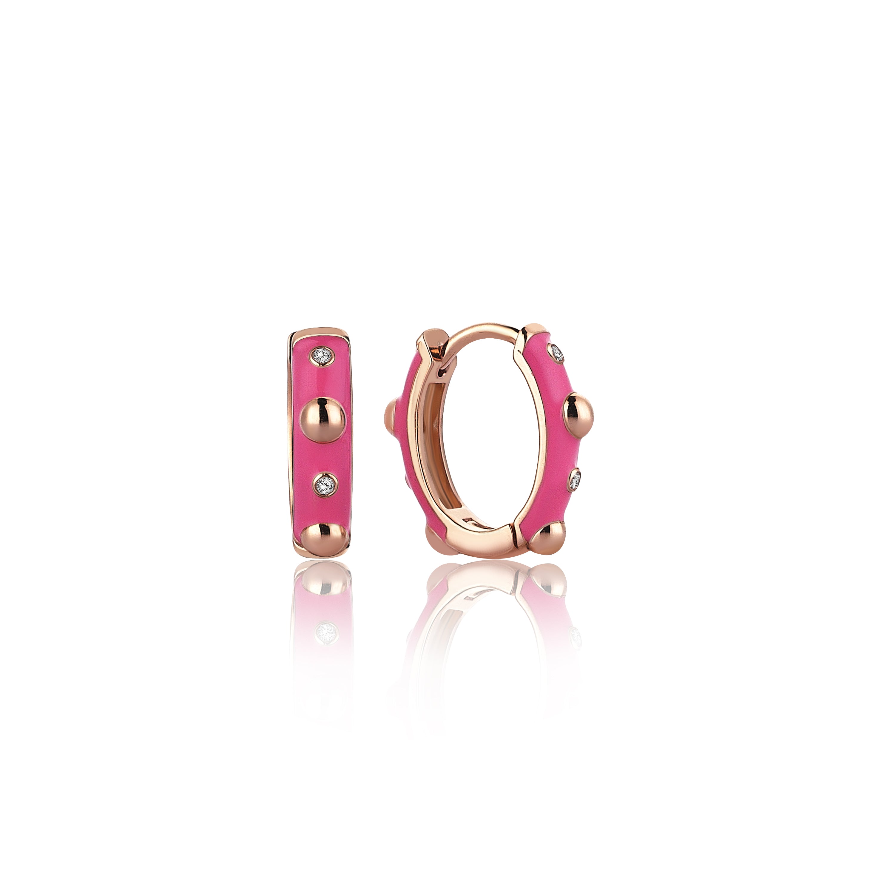 Feminen dokunuşların modern tasarımla buluştuğu Neomi Small Bubble Pembe Mineli Pırlanta Halka Küpe, 14 ayar rose altının sıcak tonlarını canlı pembe mine ve zarif pırlanta detaylarıyla bir araya getiriyor.
