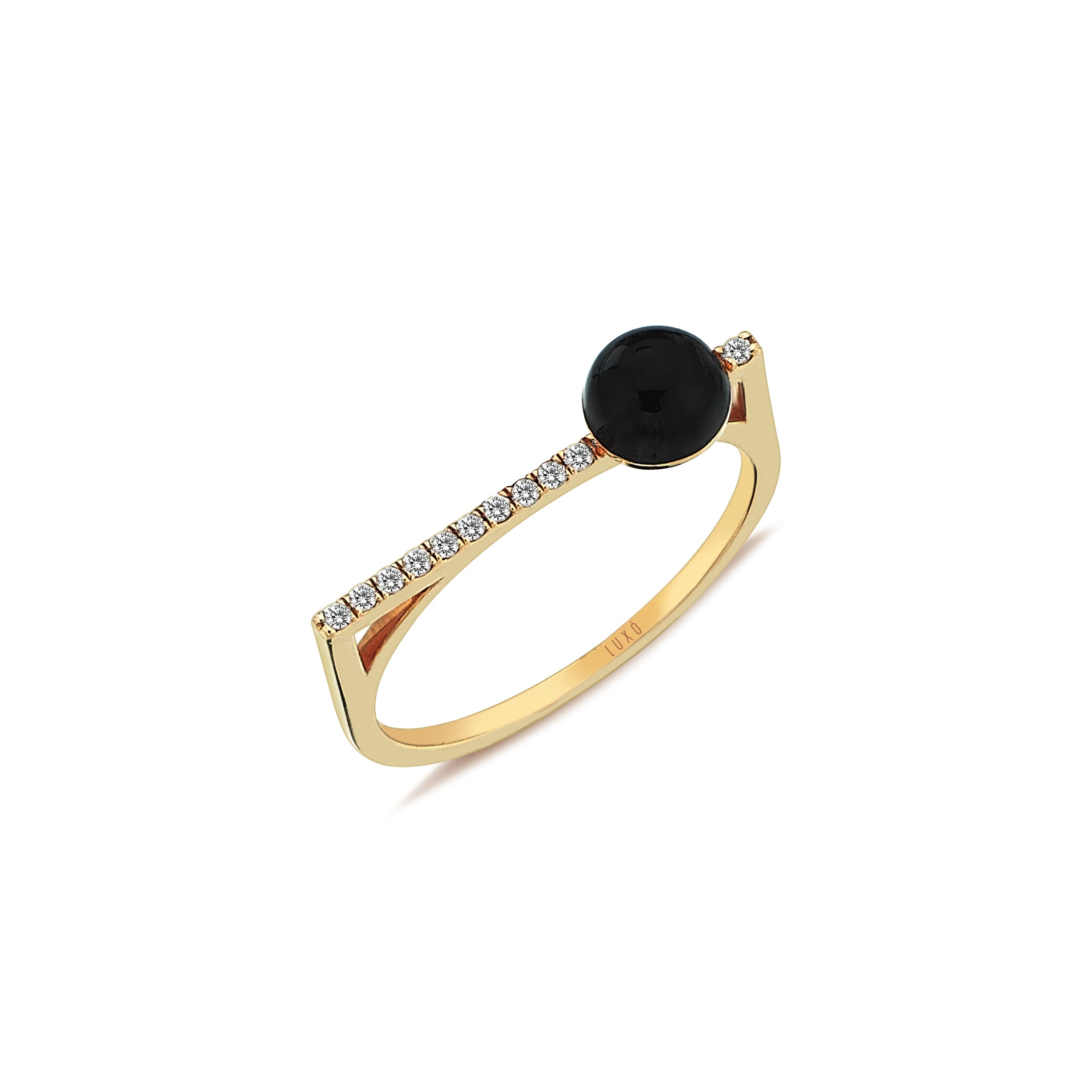 14 ayar rose altının sıcak tonları, siyah minenin derin ve etkileyici dokusuyla birleşerek sofistike bir kontrast yaratıyor. Yüzüğün merkezinde yer alan büyük siyah mineli küre, tasarıma cesur ve çarpıcı bir hava katıyor.