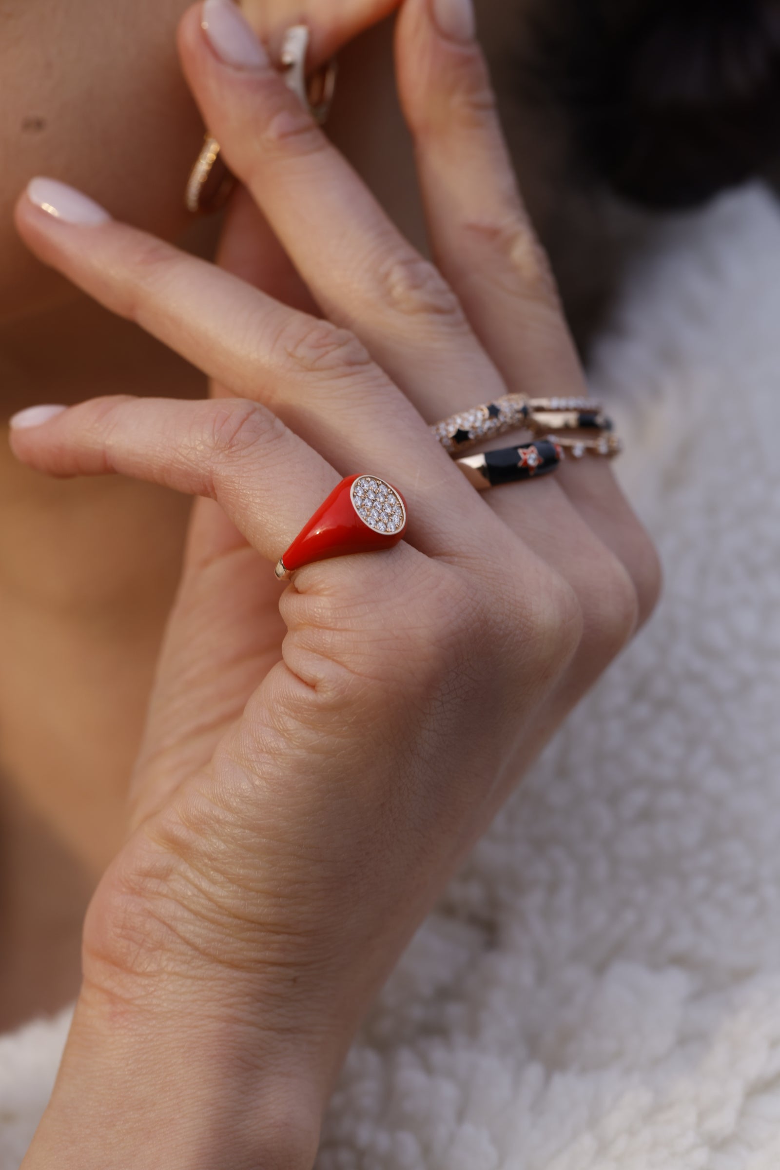 Bu 14 ayar rose altın yüzük, tutkunun ve güzelliğin dansını temsil eder. Bu eşsiz yüzük, kırmızı minenin etkileyici rengi ve incelikle yerleştirilmiş pırlanta taşlarıyla zenginleştirilmiştir. Adeta bir aşk şarkısı gibi, bu yüzük sıcaklığı, tutkuyu ve zarafeti bir araya getirerek benzersiz bir görünüm sunar.
