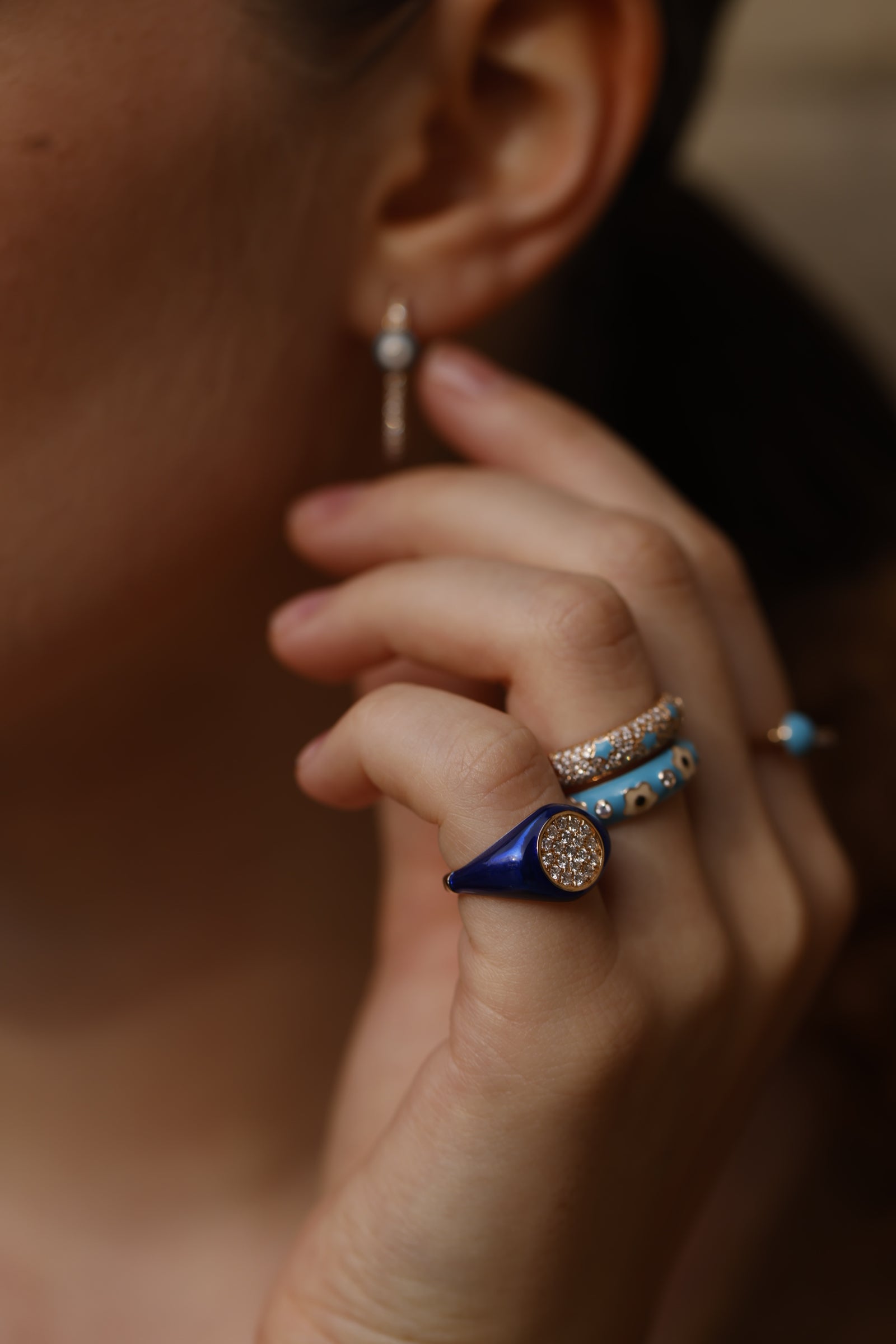 Neomi Gravity, yerçekiminin büyüleyici etkisiyle tasarlanmış, modern ve şık bir mücevher parçasıdır. Bu eşsiz 14 ayar rose altın yüzük, lacivert minelerin zarif dokunuşuyla süslenmiş ve incelikle yerleştirilmiş pırlanta taşlarıyla zenginleştirilmiştir.