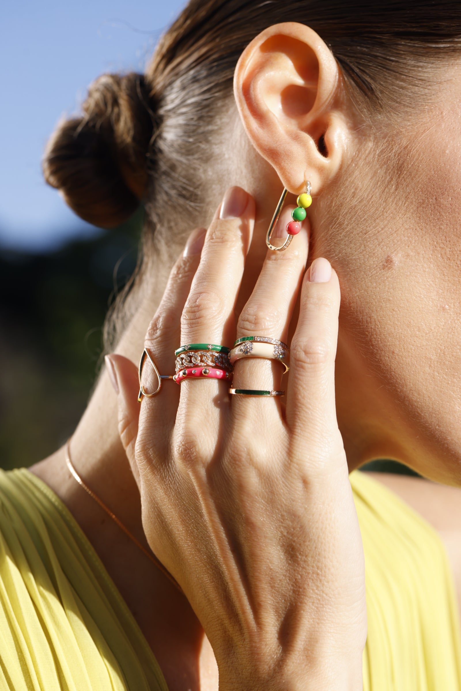 Her bir mineli top, güneş ışığını yansıtan canlı bir enerji yayarken, küpenin iki yanına özenle yerleştirilen pırlantalar, tasarıma sofistike bir ışıltı katıyor. Renklerin bu mükemmel uyumu, stilinizde hem eğlenceli hem de şık bir atmosfer yaratıyor. Neon tonların dinamizmi ve pırlantaların zamansız ışıltısı, tasarımın her detayıyla bir araya gelerek benzersiz bir estetik sunuyor.