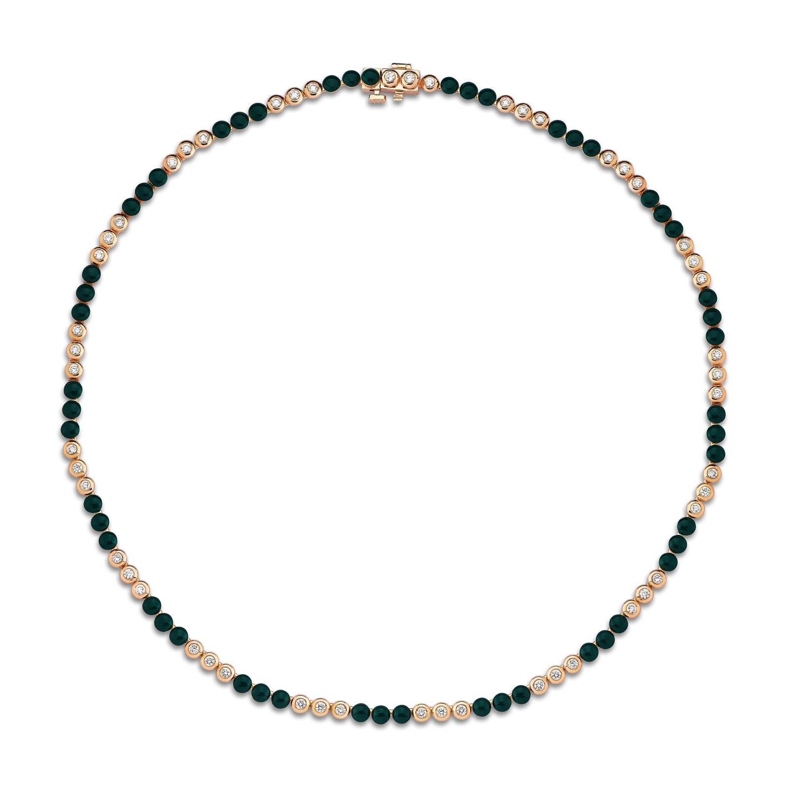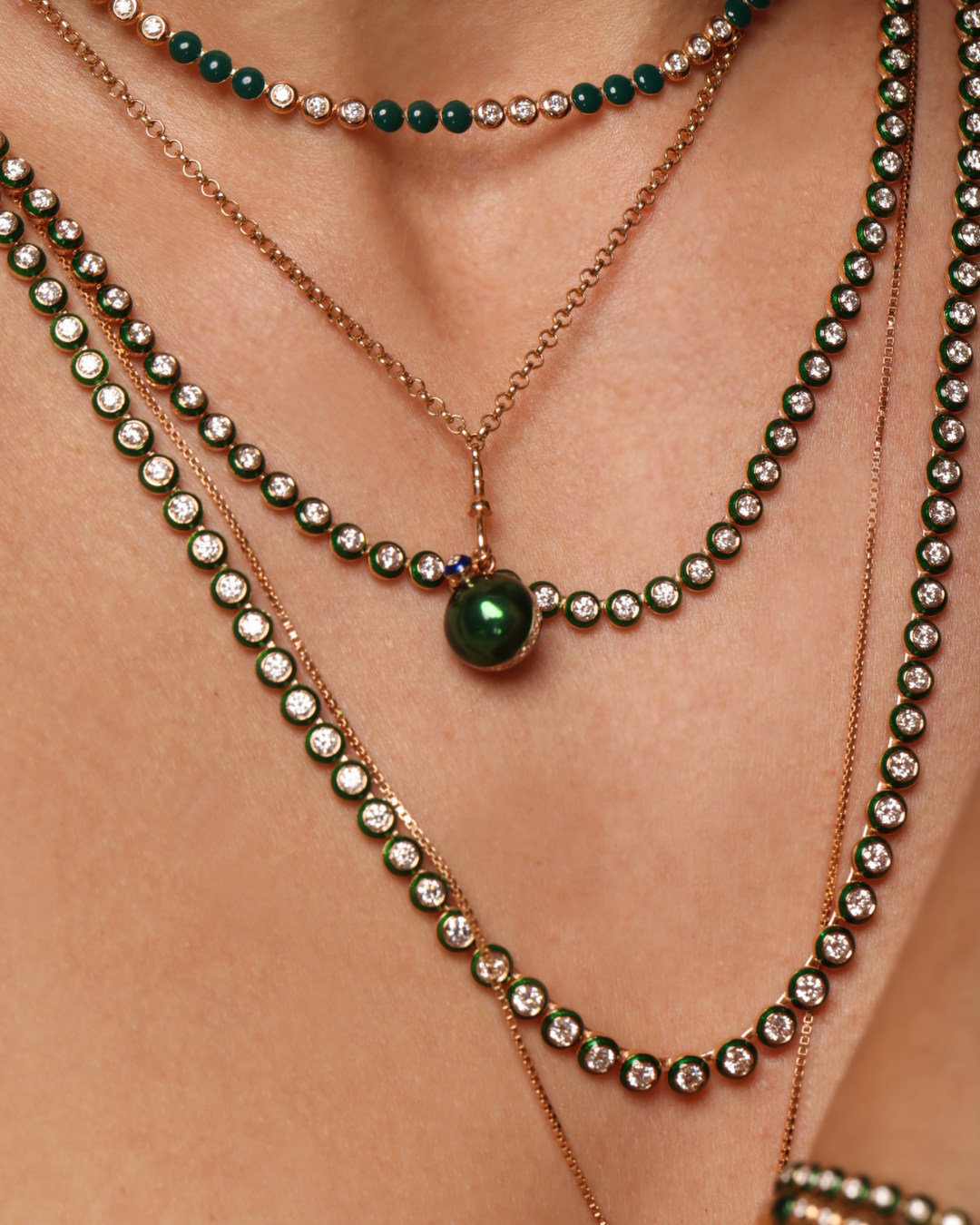 Diziliminde yeşil mine detayları ve ışıltılı pırlantalar dönüşümlü olarak kullanılarak dinamik ve göz alıcı bir tasarım ortaya çıkıyor. Kolyenin her hareketinizde ışığı yakalayan yapısı, gece ve gündüz şıklığınıza mükemmel bir uyum sağlıyor.