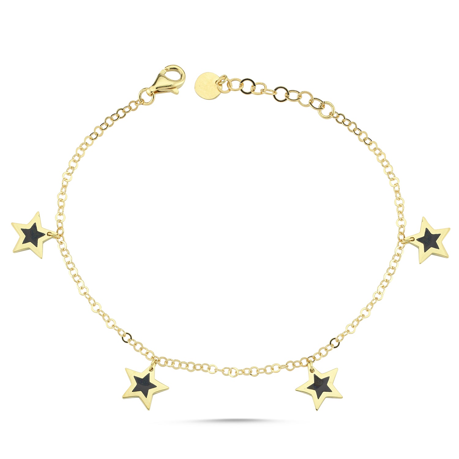 Işıl ışıl 14 ayar rose altından tasarlanan bu zarif zincir bileklik, bileğiniz boyunca zarifçe sallanan siyah mine yıldızlarla süslenmiştir. Yıldızların her biri, sıcak rose altının üzerinde çarpıcı bir kontrast oluşturarak dikkat çeker.