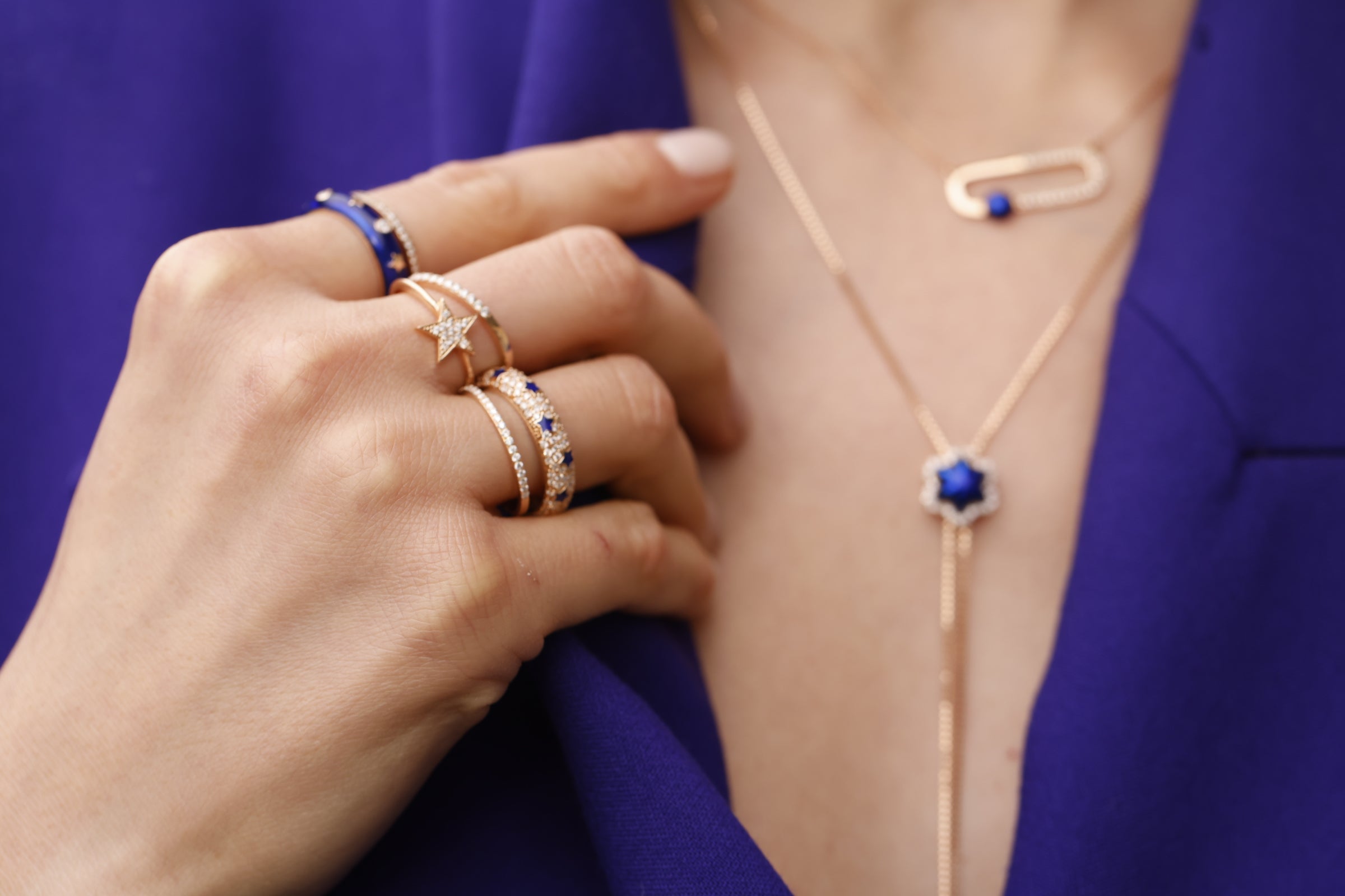 Yıldız motifinin lacivert minelerle buluştuğu Stellar Yüzük, modern ve sofistike kadınların tarzını yansıtan bir başyapıttır. Lacivert mineler, gece gökyüzünün derinliğini anımsatırken, incelikle yerleştirilmiş pırlanta taşları yıldızın parlaklığını vurgular.